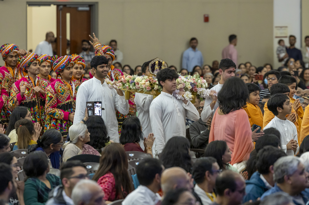 In the evening, a special cultural performance led by youths included spiritual discourses, musical performances, and devotional dances and vignettes, all highlighting the teachings and life of Bhagwan Shri Ram and Bhagwan Shri Swaminarayan. During the assembly, a grand procession marched through the audience carrying a beautifully decorated sacred image of Bhagwan Shri Ramchandra and Bhagwan Shri Swaminarayan. The joyous procession resonated throughout the assembly hall, filling the air with spirituality and devotion.