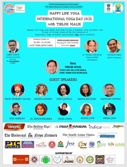 On the occasion of International Yoga Day 2025, the Global Organization of People of Indian Origin (GOPIO), which is an international network of people of Indian origin. Emmy-nominated filmmaker and Founder and speaker of “Happy Life Yoga,” Tirlok Malik, in collaboration with The Indian Panorama and the Indian American Forum, will host a vibrant, interactive Happy Life Yoga event featuring a lineup of speakers from diverse walks of life. Ambassador Binaya Srikanta Pradhan, Consul General of India in New York, will be the Chief Guest. Other distinguished speakers include Dr. Thomas Abraham (Chairman of GOPIO International), Prakash Shah (GOPIO President), and Meera Gandhi (founder and CEO of Giving Back Foundation). Professor Indrajit Saluja (Chief Editor of The Indian Panorama), Indu Jaiswal (Chairperson of Indian American Forum), Beena Kothari (President of AIA NY), Praveen Chopra (Founder of Lotus in the MUD), Anil Narang (Vegan Ambassador), Dr. Renee Mehrra, Neha Lohia (Filmmaker) and Sneha Jain (Filmmaker).