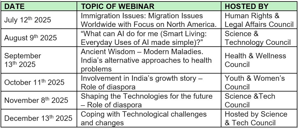 These webinars are scheduled to start from July 12th the 2nd Saturday at 9 am ET /6 am PT, 2pm UK, 3-5 pm across Europe, Africa & Middle East, 6:30 pm in India and 11 pm in Australia and Sunday July 13th 1 am in New Zealand. Subsequently every Second Saturday of each Month, the community is expected to rally around for deliberating and learning on a specific theme relevant to a sub-section of the members of the GOPIO family. A case in point being the World Yoga Day celebration during June drew hundreds of attendees across multiple cities from around the world.