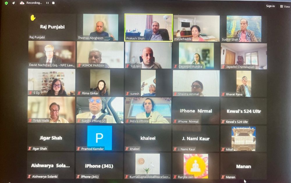 GOPIO Immigration Issues Webinar Organizers, Chief Guest, Moderator and Panellists: First Row: Prakash Shah, Dr. Thomas Abraham, Gaganjot Mundra; Second Row: Prof. Maya Chadda, Dr. Sudhir Shah, David Nachman; Thord Row: Lord Bhikhu Parekh, Sid Jain, Shaima Ammal; Fourth Row: Stephanie Dy, Raj Punjabi and Kumu Gupta