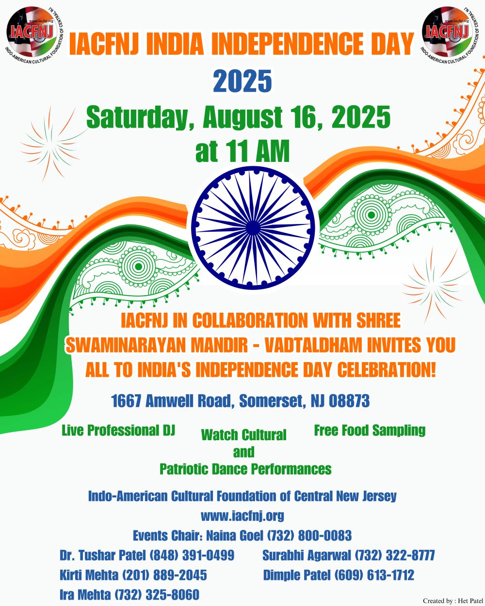 The Indo-American Cultural Foundation of Central Jersey (IACFNJ) will host a grand celebration of India’s Independence Day on Saturday, August 16, 2025, from 11 a.m. at Shree Swaminarayan Temple (Vadtal Dham), 1667 Amwell Road, Somerset, NJ 08873.