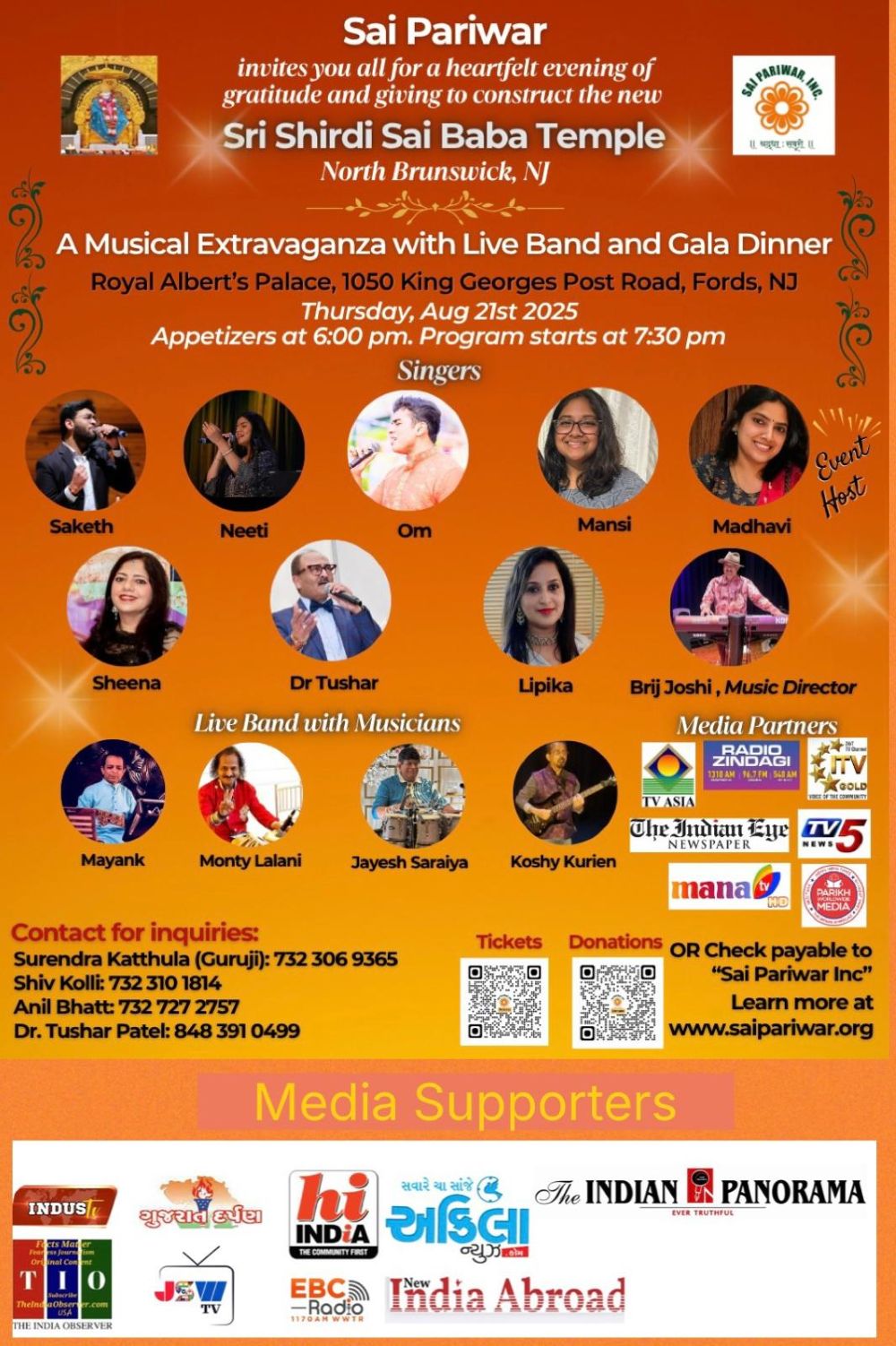 Sai Pariwar, Inc. and Sai Temple, a respected 501(c)(3) nonprofit organization with a 22-year legacy of serving the Central Jersey spiritual community, will host a special fundraising musical gala on Thursday, August 21, 2025, beginning at 6:00 p.m. at Royal Albert’s Palace in Fords, New Jersey. This festive evening aims to raise funds for the construction of a new Sai Temple and Cultural Center in North Brunswick.