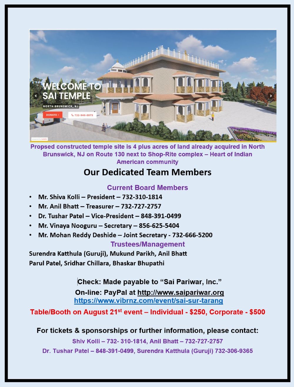The vision of Sai Pariwar for this temple is rooted in the principles of Seva (selfless service), Shraddha (faith), and Saburi (patience). To bring this vision to life, the organization has launched a capital campaign to raise $5 million. The Board of Trustees and Temple Committee are appealing to all devotees, community members, and well-wishers to participate in this noble endeavor. They encourage everyone to attend the musical gala and to contribute generously towards the construction effort. Contributions of any size are welcomed, and sponsorship opportunities are available for various parts of the temple structure, including deity spaces, halls, puja rooms, and more. In addition to its year-round spiritual services and worship, Sai Pariwar of North Brunswick actively engages the broader community through a variety of inclusive programs. These include weekly medical camps, yoga and holistic healing workshops, and celebrations of major Hindu festivals. The organization also hosts arts, dance, and music workshops, along with food drives that serve individuals and families in need. All of these activities are open to the public, reflecting Sai Pariwar’s commitment to service, wellness, and cultural enrichment for all.