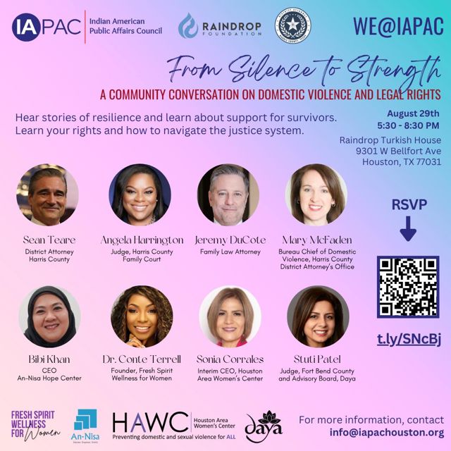 The Indian American Public Affairs Council (IAPAC), in partnership with the Raindrop Foundation and the Harris County District Attorney’s Office, invites the Houston community to an important and inspiring evening—From Silence to Strength: A Community Conversation on Domestic Violence and Legal Rights—on Friday, August 29, 2025.