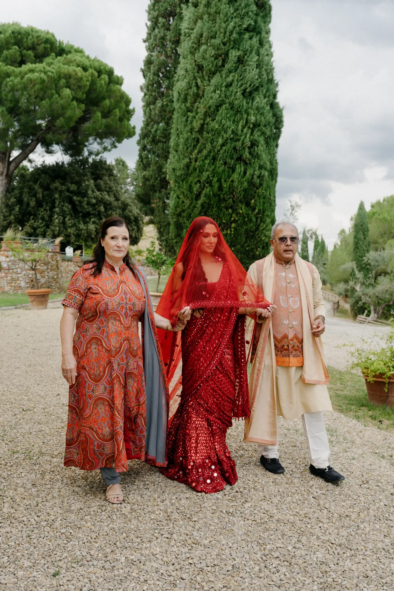 The following day, in the gardens overlooking the Tuscan hills, Shah and Massoud held a Hindu wedding ceremony. The bride wore a bespoke red Arpita Mehta sari with a matching corset blouse and silver kitten heels from Dolce Vita. Her veil featured a quote that translates to, “On his peaceful land, my flame found rest,” their horoscope symbols and the word Om, while her mehendi by Suhenna Creations included their zodiac signs and constellations. “It was important for me to support a female Gujarati designer whose designs were modern yet honoured our traditions, and Arpita and her team were a dream to work with. I paired the handmade sari with my ba’s diamond bangles, a custom mangalsutra from Modern Mangal with a ruby and diamond set consisting of earrings, a bracelet, and a nose ring from Sanzany,” shares Shah.