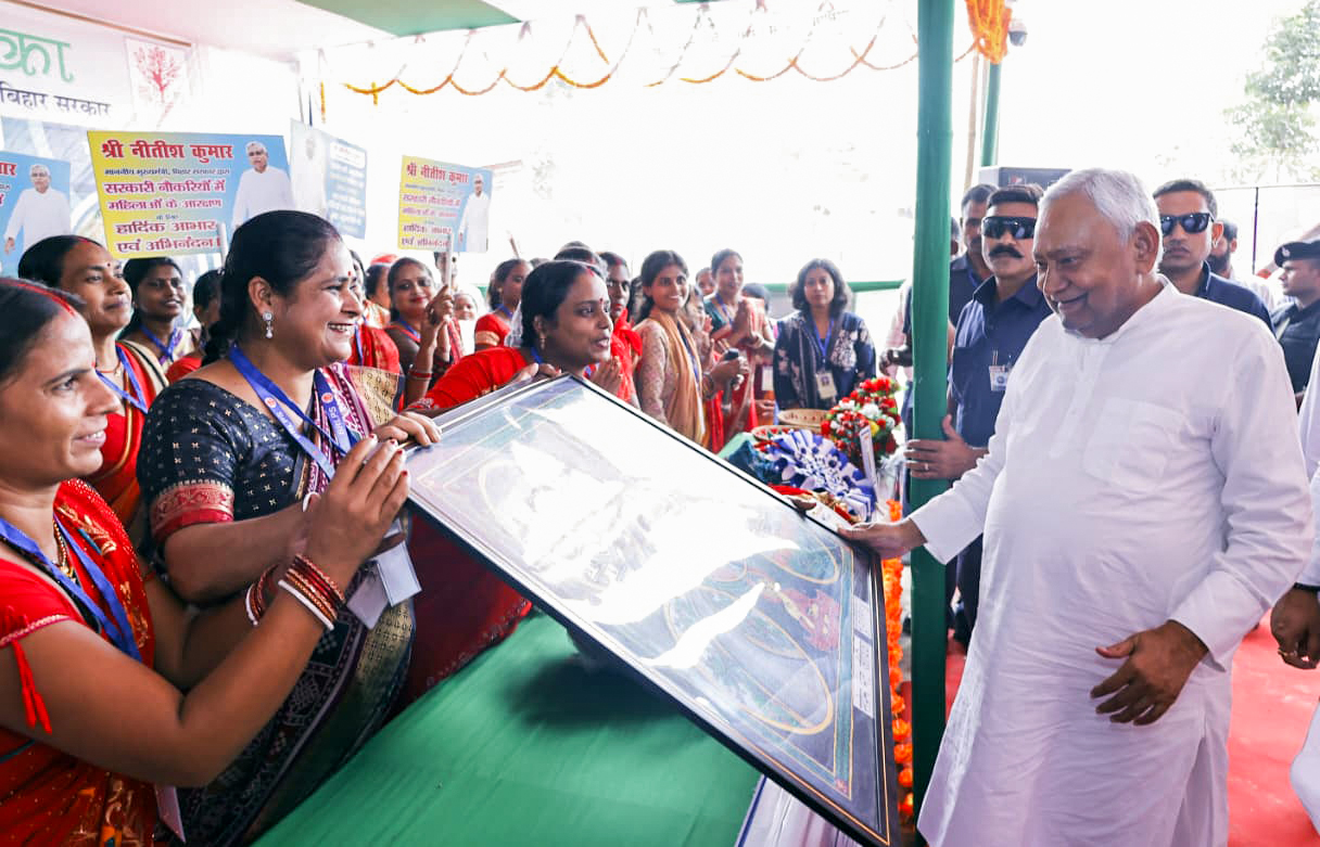 Bihar Chief Minister Nitish Kumar interacts with women during the inauguration and lays the foundation stone for 22 development projects in Muzaffarpur (ANI Photo)