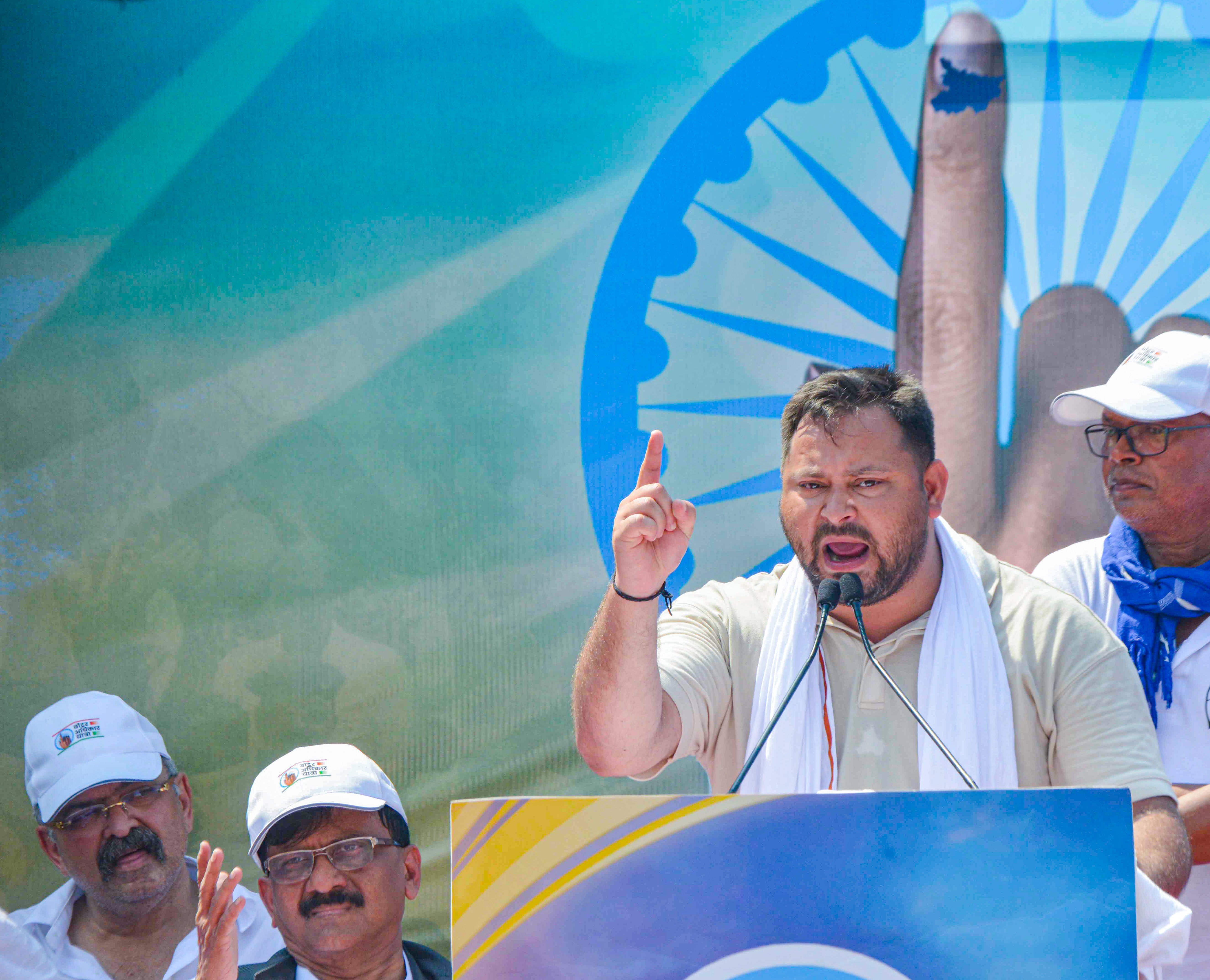 LoP in Bihar Legislative Assembly and RJD leader Tejaswi Yadav addresses during a road show in Patna (ANI Photo)