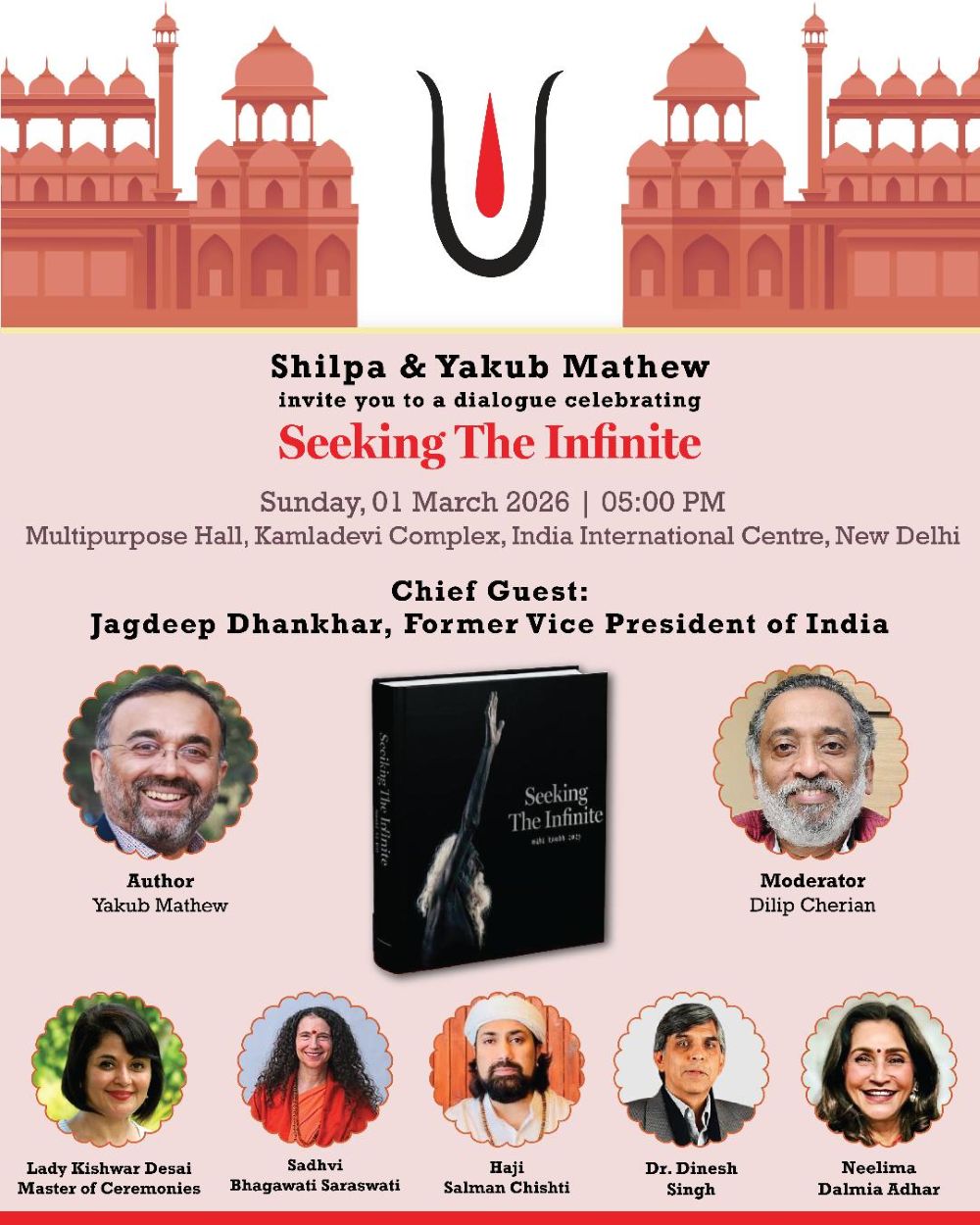The India International Centre (IIC) will host the formal launch of Seeking The Infinite by author and global banking executive Yakub Mathew, at a ceremony presided over by former Vice President of India Shri Jagdeep Dhankhar. The event, scheduled for Sunday, March 1, 2026 at the Kamladevi Complex at The India International Centre in New Delhi, is expected to draw an assembly of distinguished leaders from the fields of spirituality, academia, literature, and public life.